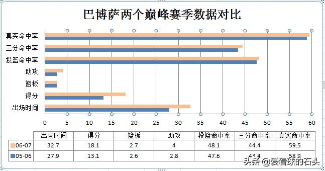 05-06赛季巴博萨数据出现跳跃式增长,出战57场首发11场,场均27.9分钟贡献13.1分2.6篮板2.1助攻,三分命中率也来到了44.4%。