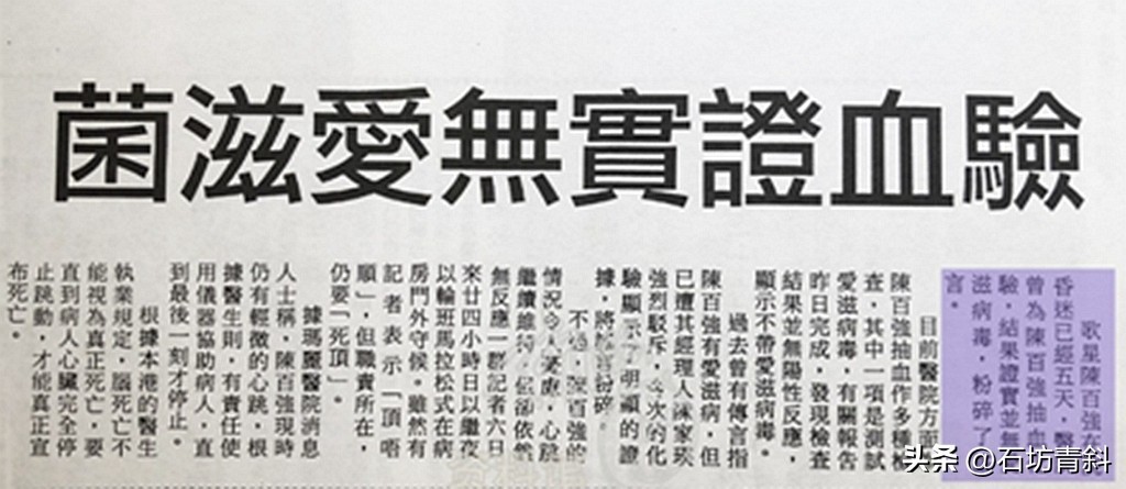 因而,当陈百强的胃液、尿液等仍在化验之中,有关他的传闻已如满天雪花:有说他得是的艾滋;也有说他吃药过多是出于厌世轻生之念;更有甚者,香港新城电台在播送陈百强的名曲时,附加了一句:“这首歌,送给在天堂的陈百强。”