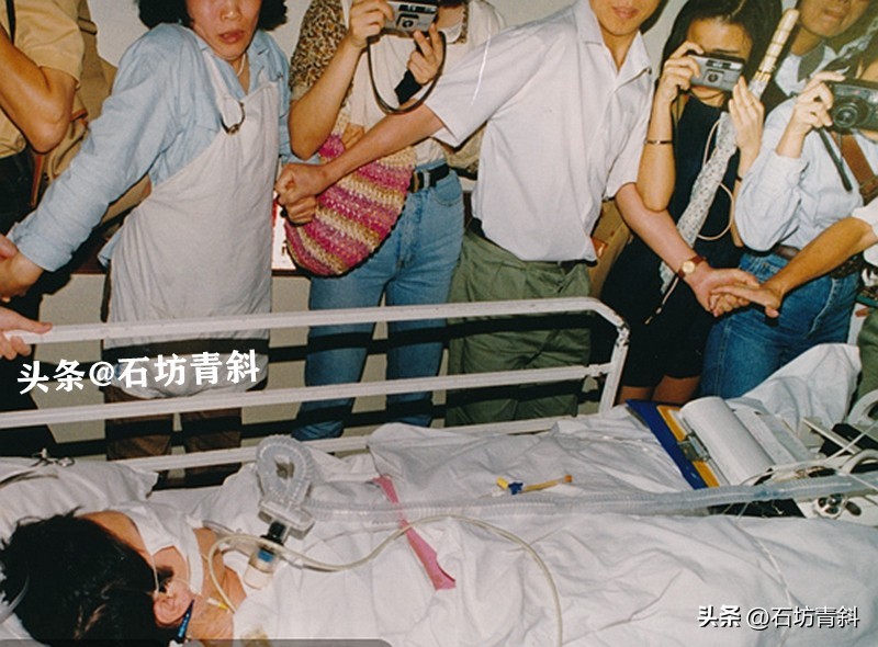 第2天,仍然昏迷中的陈百强双眼用白眼罩蒙盖着,病床架上吊着盐水。