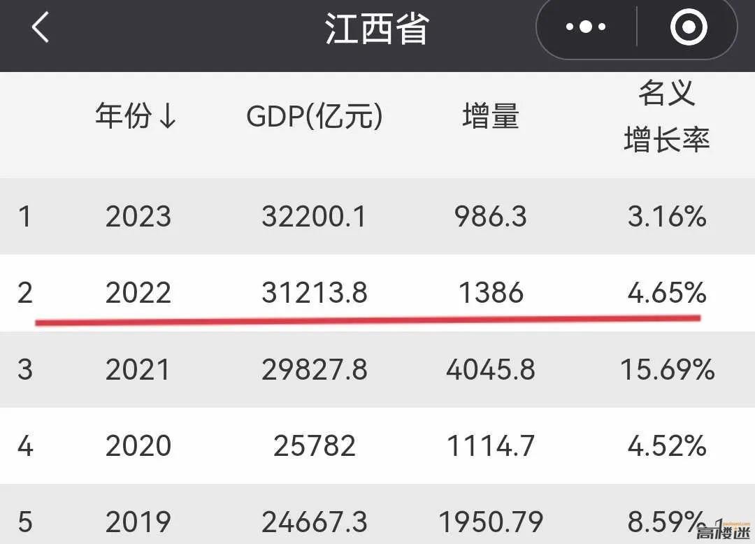 2023年1月22日江西省统计局在其官网发布了,2023年江西省经济运行情况数据,首先祝贺2023年江西省GDP总量,达到了32200.1亿元人民币,同比增长了4.1%,从增速来看江西省完全跑输了,全国经济5.2%的平均增速,名义增速为3.16%,也完全跑输了全国4.6%的平均名义增速,名义增量为986.3亿元人民币,这份成绩单可以用很差劲来形容了。问题的关键是,江西省2023年度,只有986.3亿元人民币的GDP增量,这是为何呢?到底发生了什么?我记得两年前江西省每年,三四千亿的GDP增量,是存在虚高现象吗?是假象还是真繁荣?