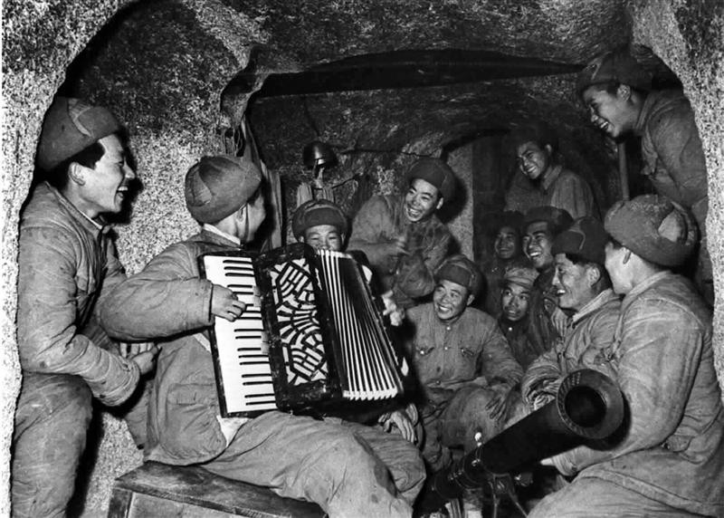 在朝鲜战场,战斗间隙,坑道里歌声、笑声不断。 (新华社发)