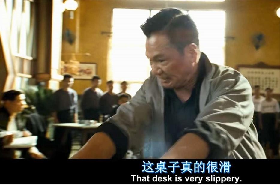 在甄子丹主演的《叶问2》中,当罗师傅和叶问在圆桌上对战时,观众们本以为将会看到一场旗鼓相当的精彩打斗,哪想竟被叶问几招轻松撂倒时,起身竟为自己的失败找了如此一个理由:“这桌子真的很滑!”