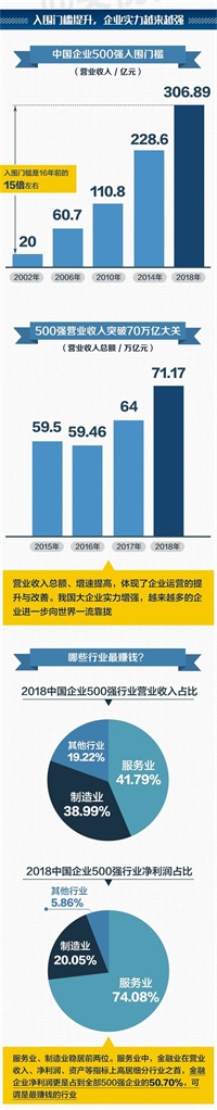 “2018中国企业500强”中33家金融企业实现营业收入、净利润分别为10.7万亿元、1.7万亿元,分别占全部企业的15.0%、65.8%。