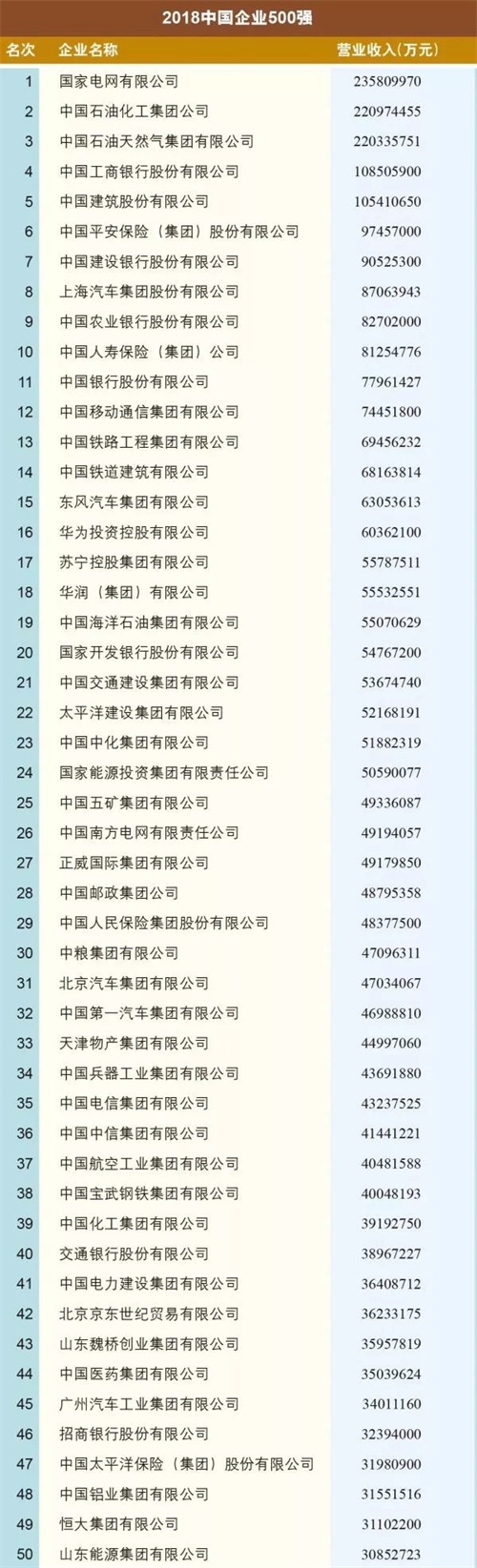 2018中国500强企业榜单出炉:总营收突破70万亿大关 国网2.35万亿蝉联榜首