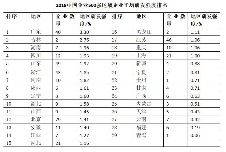 不过,看榜单当然不能只看当下,还要着眼未来。研发强度是企业研发费用与收入之比,代表着企业创新的空间与潜力。从这点看,研发强度最高的是广东,广东省企业以3.3%的研发强度在所有区域中明显领先。