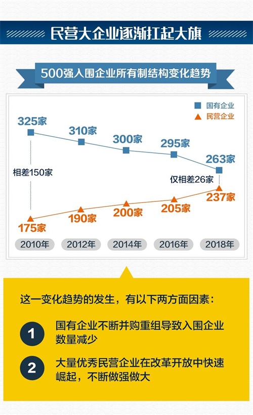 2018年中国企业500强中有237家民营企业,比上年增加了11家,占比为47.40%,国有与民营企业入围数量差距进一步缩小。