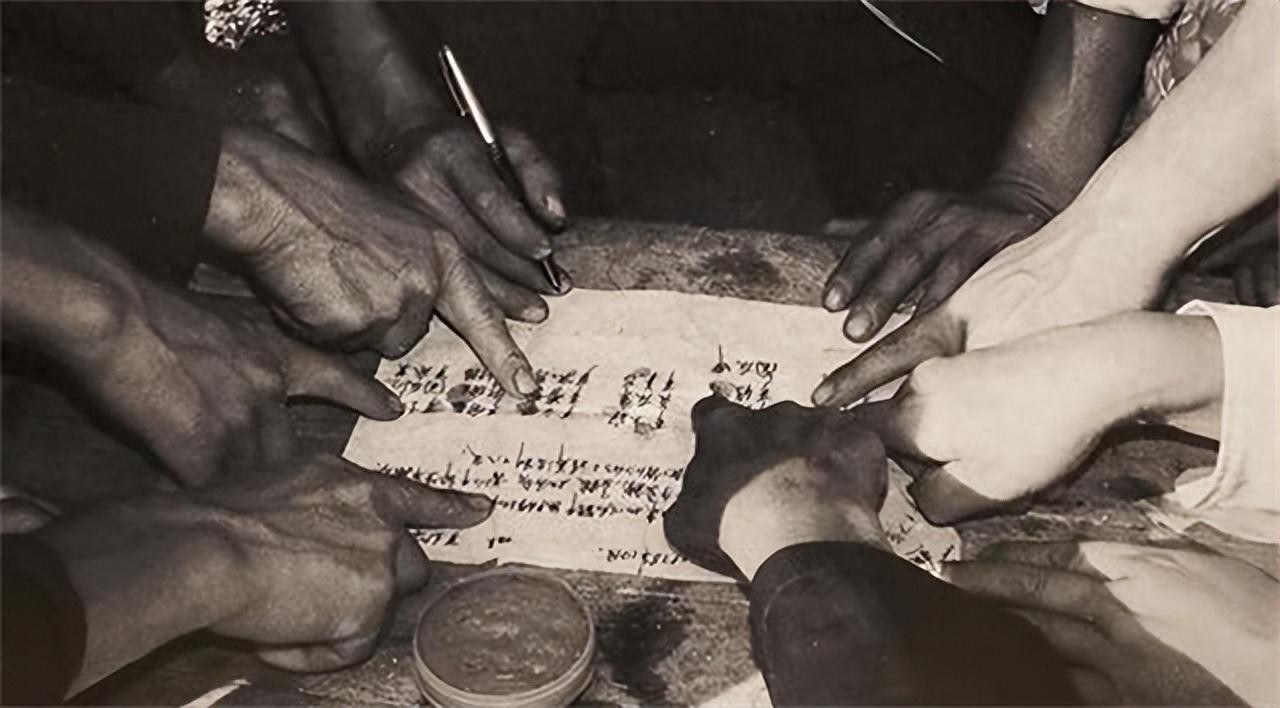 他们手中紧握着一张香烟壳,上面密密麻麻写满了名字。每一个名字下,都郑重地按着一枚红手印。