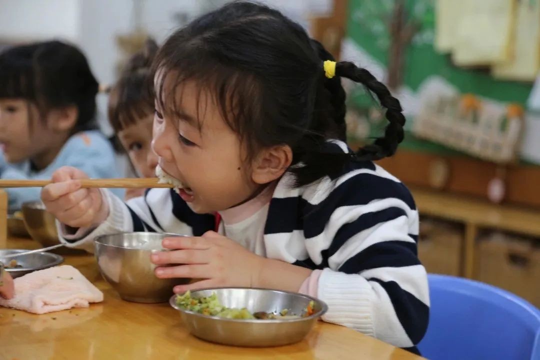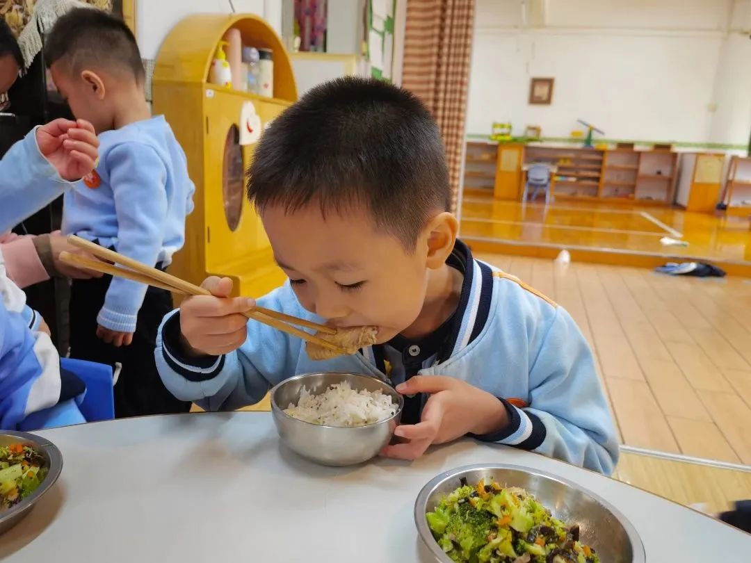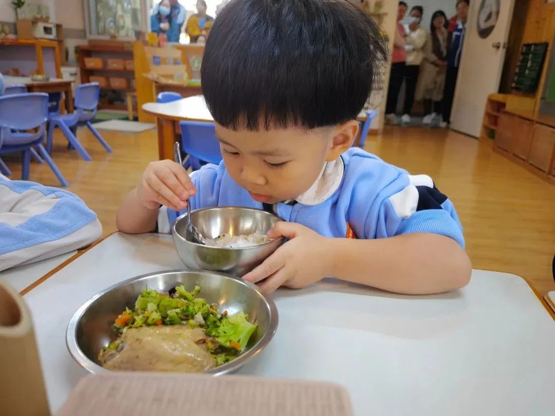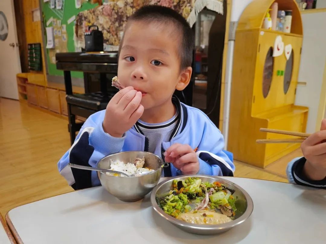 “咕噜咕噜”,能量补给时间终于到了,孩子们自主盥洗,独立进餐,小小的身影让家长们看到了大大的成长。
