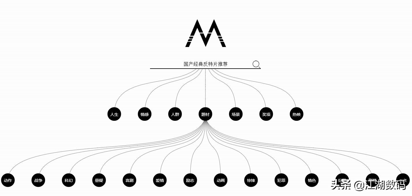 从网站首页就可以看出和其他电影网站风格的明显不同,是非常严谨的思维导图画风….没有一股劲往上怼各种广告链接。整体的风格都是非常性冷淡的黑白灰色系,还可以改变背景和音效,都是电影级别;