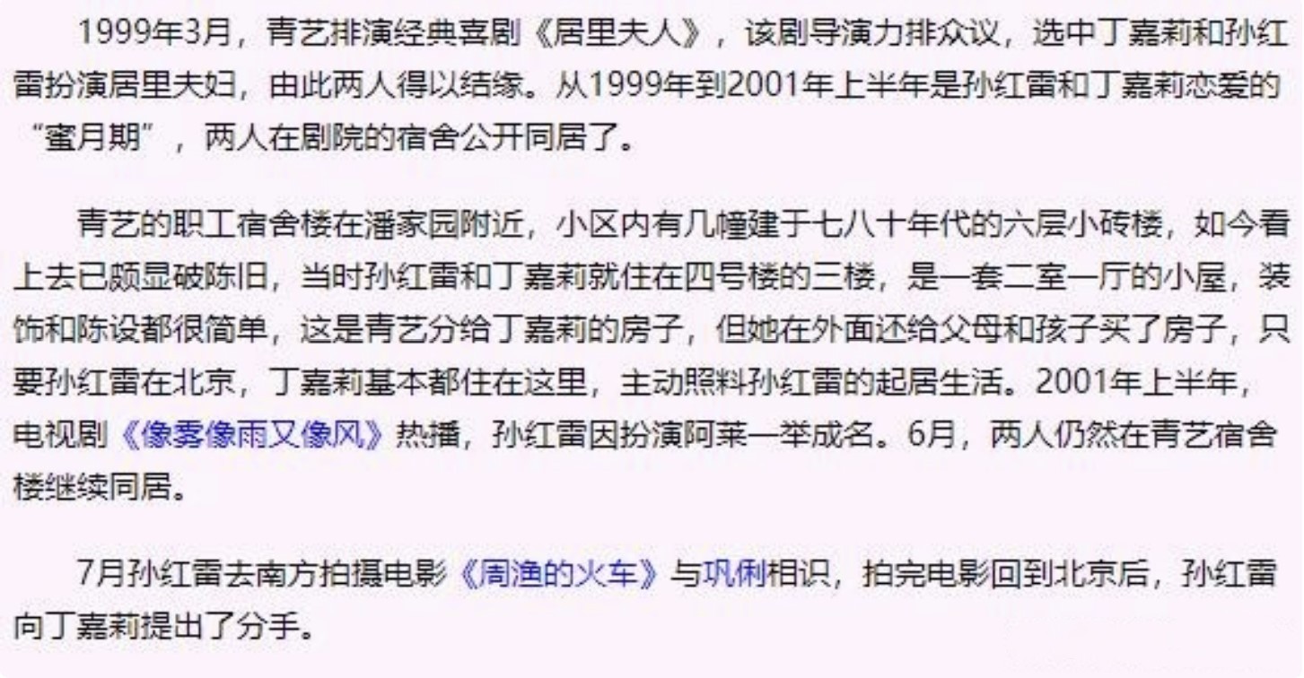 孙红雷和丁嘉丽由于年龄差距的原因被家长反对,最后分手了。孙红雷的爸爸接受采访说:“他们不会有结果的。”