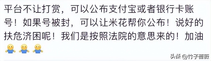 “平台不让打赏的话,可以公布支付宝账号或者银行卡账号,如果号被封,可以让别人帮你公布,说好的扶危济困呢!加油!”