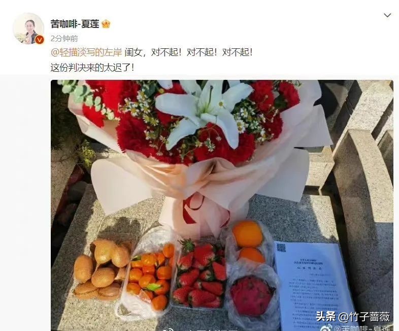 二审判决出来后,江歌妈妈来到女儿的墓地,郑重地将判决书和鲜花水果一同摆在墓前。