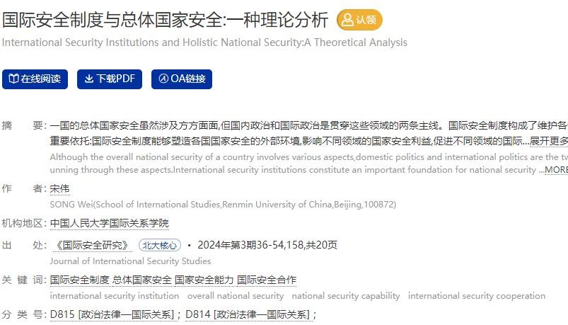参考资料:[1]宋伟.国际安全制度与总体国家安全:一种理论分析[J].国际安全研究,2024,42(3):36-54158