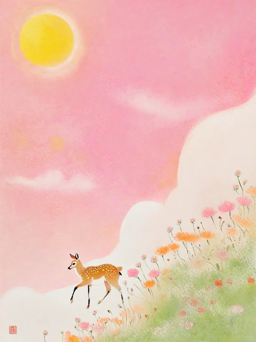 溪水、犬吠、钟声、小鹿,桃花,翠竹、青松,构成了一幅生趣盎然的诗意画面。诗人闲闲的倚在松树上,这难得的躺平摆烂式欣赏美景,这是多么惬意悠然啊。