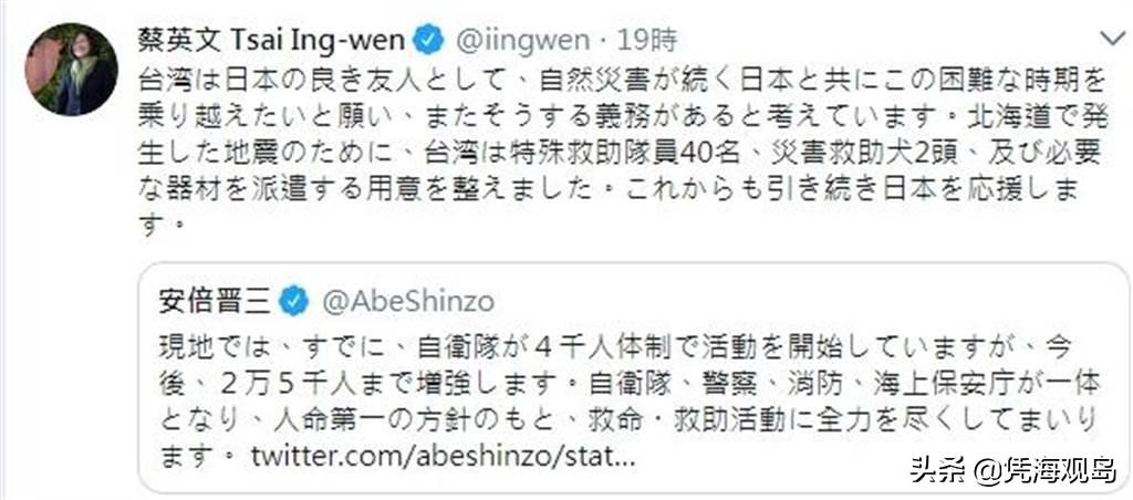 同年7月,日本九州岛暴雨灾情惨重,蔡英文在推特发文慰问,这回轮到安倍感叹“妹妹的做法”是“患难见真情”。