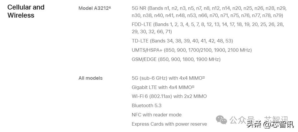 从苹果官网披露的iPhone 16e的蜂窝网络和无线连接规格来看,C1支持大多数关键的 4G 和 5G 技术,包括具有 4x4 MIMO 的 sub-6 GHz 5G网络,具有 4x4 MIMO、FDD-LTE、TD-LTE 的千兆 LTE,以及兼容 2G 和 3G 网络。