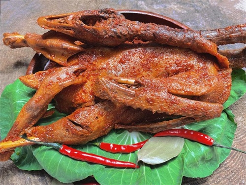 将炒制好的辣椒料均匀涂抹到鹅的身上。