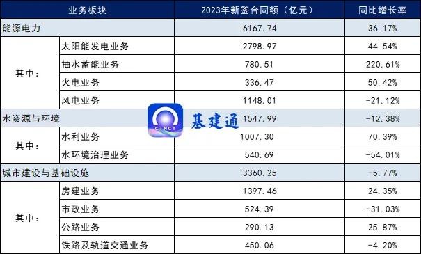 城市建设与基础设施:全面参与城镇化建设,坚持市场竞争和投资带动双轮驱动,积极参与基础设施业务市场开拓和项目竞争,持续推动基础设施业务规范健康发展,同时,进一步加大高速铁路、城际铁路市场开拓力度。2023年,新签基础设施业务合同金额 3360.25 亿元,同比减少 5.77%。
