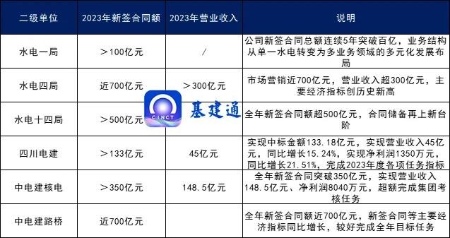 除此之外,部分二级公司也公布其年度经营业绩:水电四局的年度新签合同额接近 700 亿元,营收也超 300 亿元,主要经济指标迈上新台阶;中电建路桥年度新签合同额也接近 700 亿元,在电建系统内也排名靠前;还有水电一局、十四局、四川电建、中电建核电公司等也有发布官方经营数据: