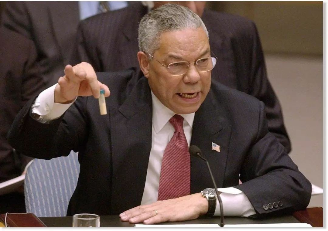 2003年2月5日,美国国务卿鲍威尔在联合国安理会上拿出了一瓶装有白色粉末的试管。他告诉各国代表,这瓶试管中的白色粉末,就是伊拉克搞大规模杀伤性化学武器的证据。为了防止化学武器危害人间,美国顶着“维护正义”的头衔派兵进入伊拉克境内进行搜查,伊拉克战争正式爆发。