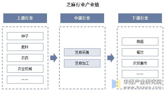 从芝麻行业产业链来看,上游与芝麻种植有关,包括芝麻种子、农药、肥料及农业机械等;中游则是芝麻的采摘和加工环节;下游主要流通至商超、餐饮、农贸集市等。