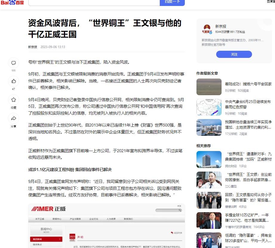 新京报2023-09-06 《资金风波背后,“世界铜王”王文银与他的千亿正威王国》的报道