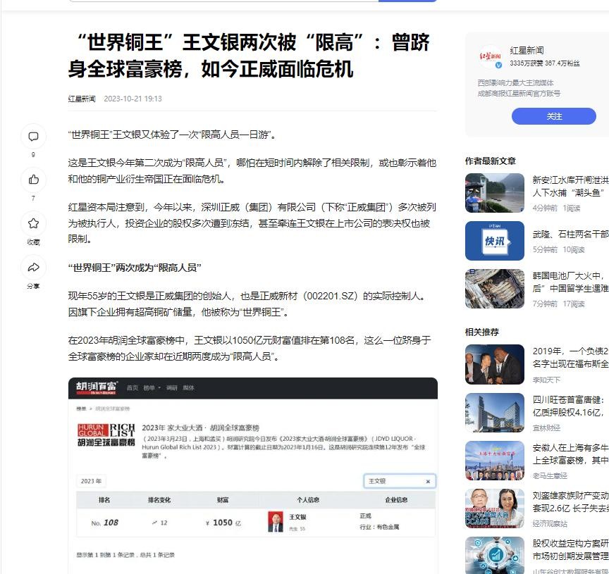 红星新闻-2023-10-21 《“世界铜王”王文银两次被“限高”:曾跻身全球富豪榜,如今正威面临危机》的报道