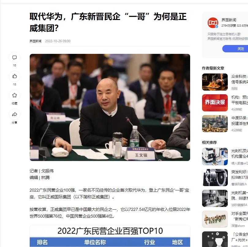 界面新闻2022-10-26《取代华为,广东新晋民企“一哥”为何是正威集团?》的报道
