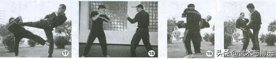 2、敌我双方对峙(见图18),敌突然发动猛攻,我不要惊慌,速用环绕步移向敌人侧方(见图19),同时速起勾踢腿反击敌之下盘或中盘(见图20),将敌一举击溃。