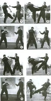 关于腿法的用法就简单的介绍上述几组战例,朋友们在实践中应本着根据实际情况“灵活运用”的原则,而不要着迷于某招破某式。李小龙曾经回答武友的问题“别人用拳打你,你该如何防”时说过,“我不知道,这要论当时的情况而定”。但搏击还是有一定原则可遵循的,现介绍如下: