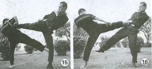 1、敌我双方对峙(见图13),敌突然出前腿侧踢踢我中盘或下盘,我速反应提膝防守(见图14-15),防住敌人进攻的同时,速顺势侧踢敌人中盘或下盘(见图16),将敌一举击溃。