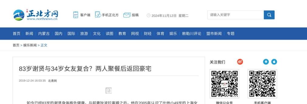 本文信源:正北方网《83岁谢贤与34岁女友复合?两人聚餐后返回豪宅》