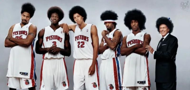 一位活塞球员不知道从哪里飞了出来,只见他用左手将米勒的上篮封盖出底线,然后人仰马翻在观众席里,然后他起身,脸上没有一点表情,还拍了拍自己撞到的球迷的肩膀。