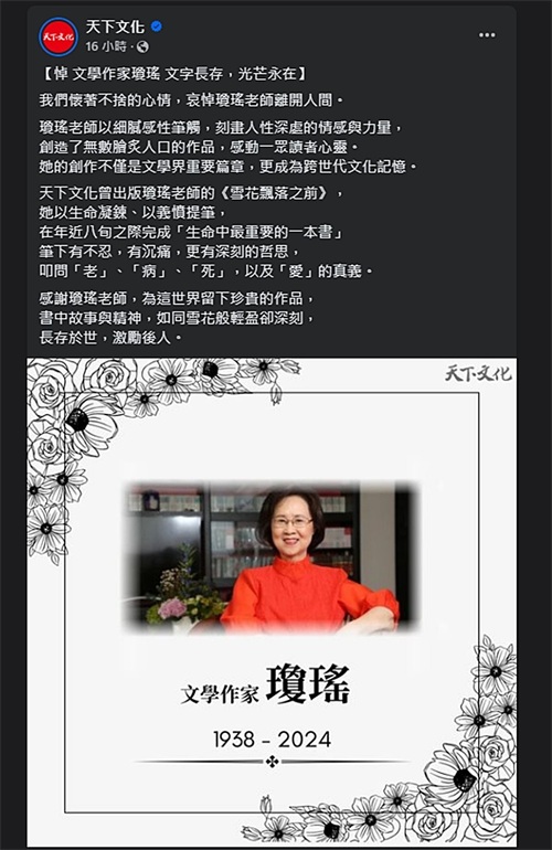 一直到 2024 年琼瑶也离开了。她生前说要低调处理后事,选花葬,啥葬礼、墓碑、公祭、宗教仪式都不要。按说人都走了,恩怨也该散了,可平鑫涛的三个孩子还是硬气得很,坚决不发一个字的悼念。皇冠集团,也跟商量好了似的,一直沉默。记者去问,就给你打马虎眼,官方账号上也跟没事人一样,啥都没有。再看看人家城邦读书花园和天下文化,那悼念文章写得情真意切,这一对比,平鑫涛子女和皇冠集团的态度就更让人捉摸不透了。