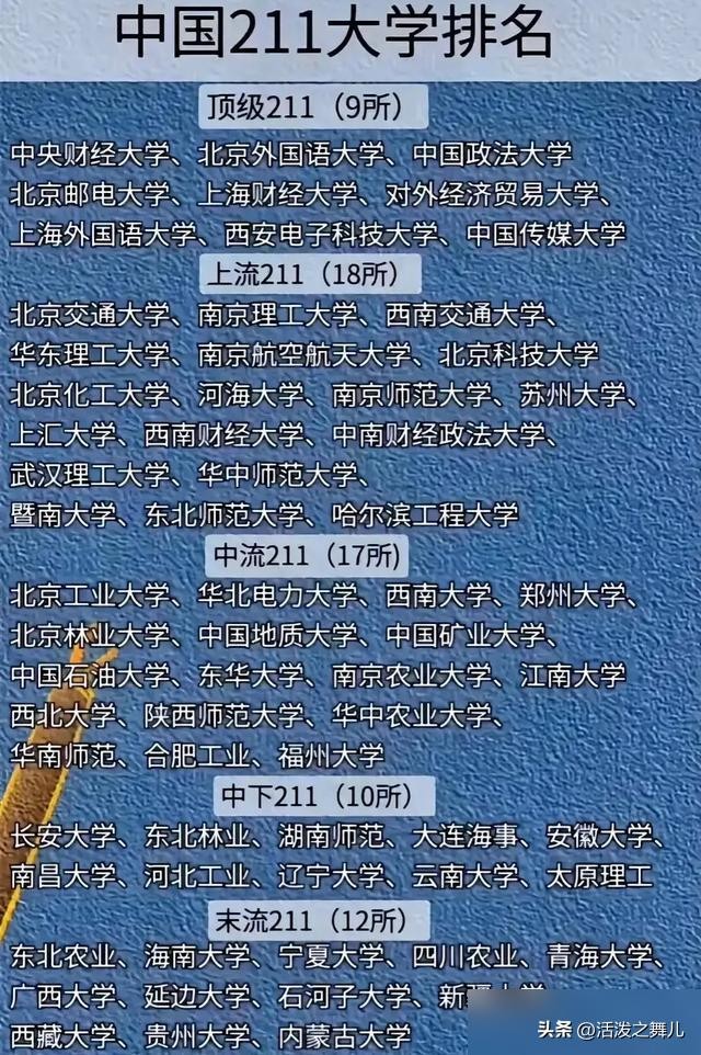 根据更新后的排名,211大学被重新划分为顶流、上流、中流和下流四个层次,其中顶流211大学共有9所,上流211大学共有18所,还有17所被划分为中流211大学。