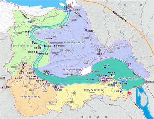 将风景区划分为不同的景区,如青羌民俗景区、青衣秀湖景区等,并为每个景区确定主体景观类型和展示方式。