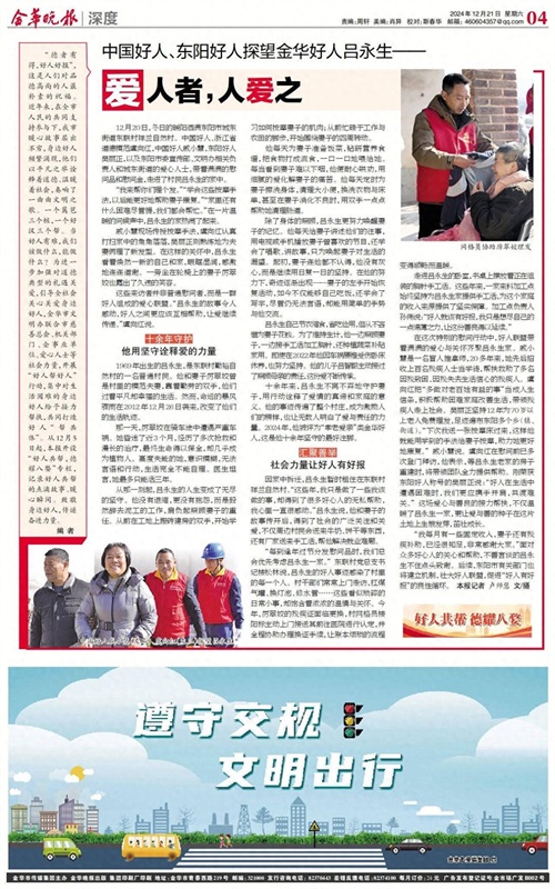 十余年来,吕永生不离不弃地守护妻子,用行动诠释了爱情的真谛和家庭的意义。他的事迹传遍了整个村庄,成为激励人们的榜样,也让无数人明白了爱与责任的力量。2024年,他被评为“孝老爱亲”类金华好人,这是他十余年坚守的最好注脚。