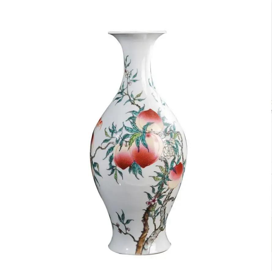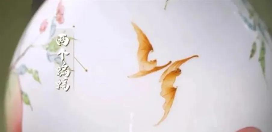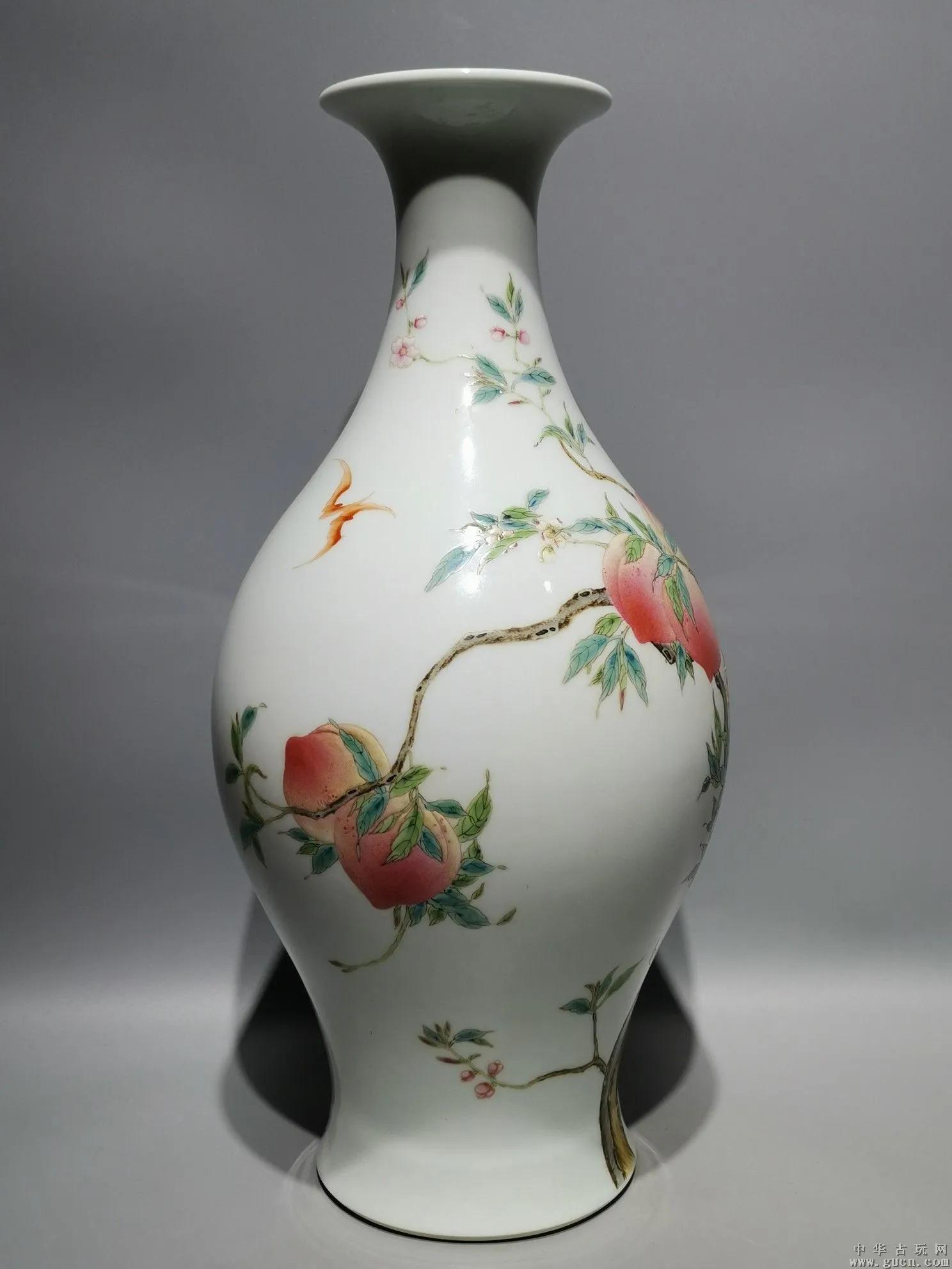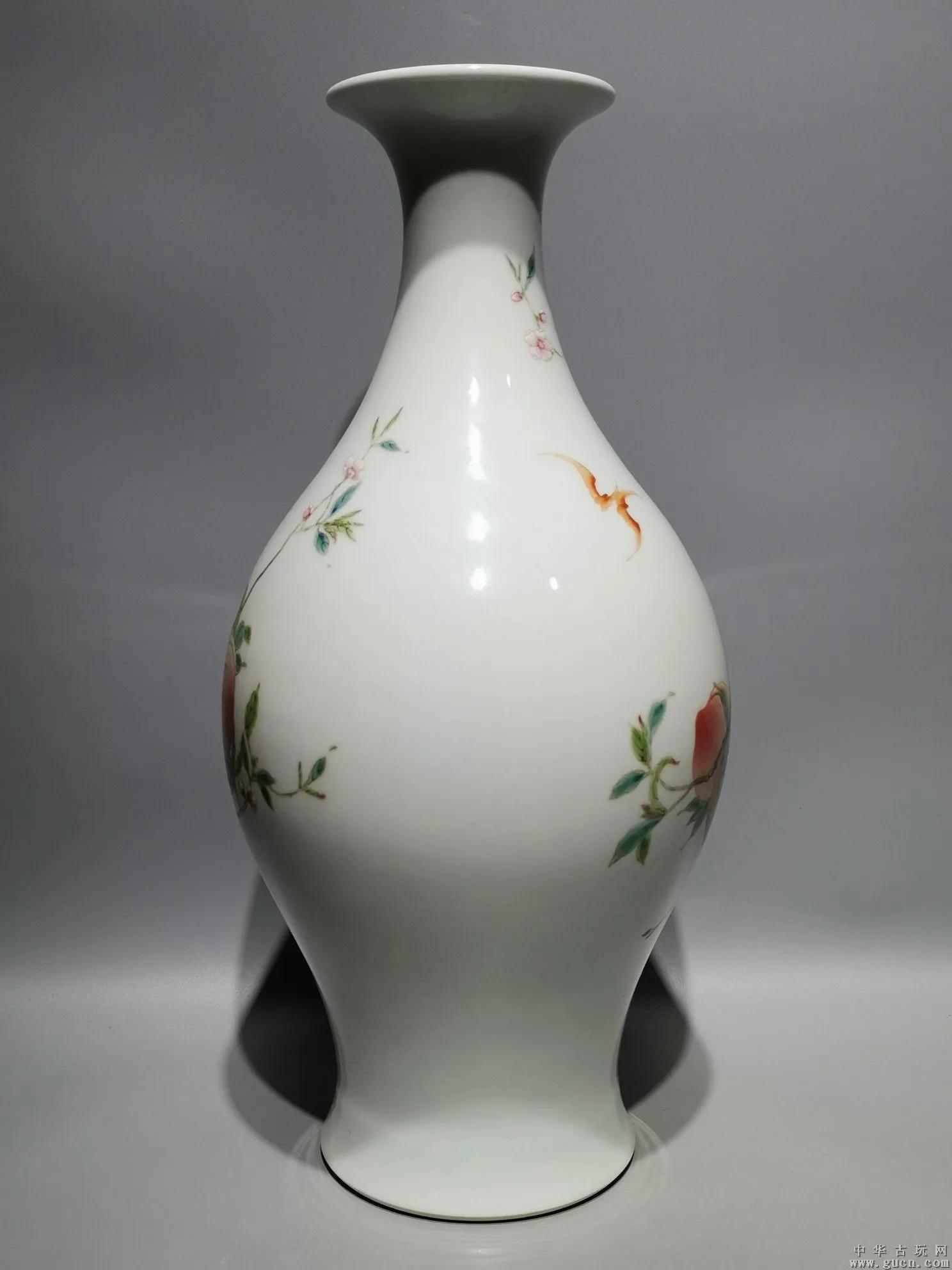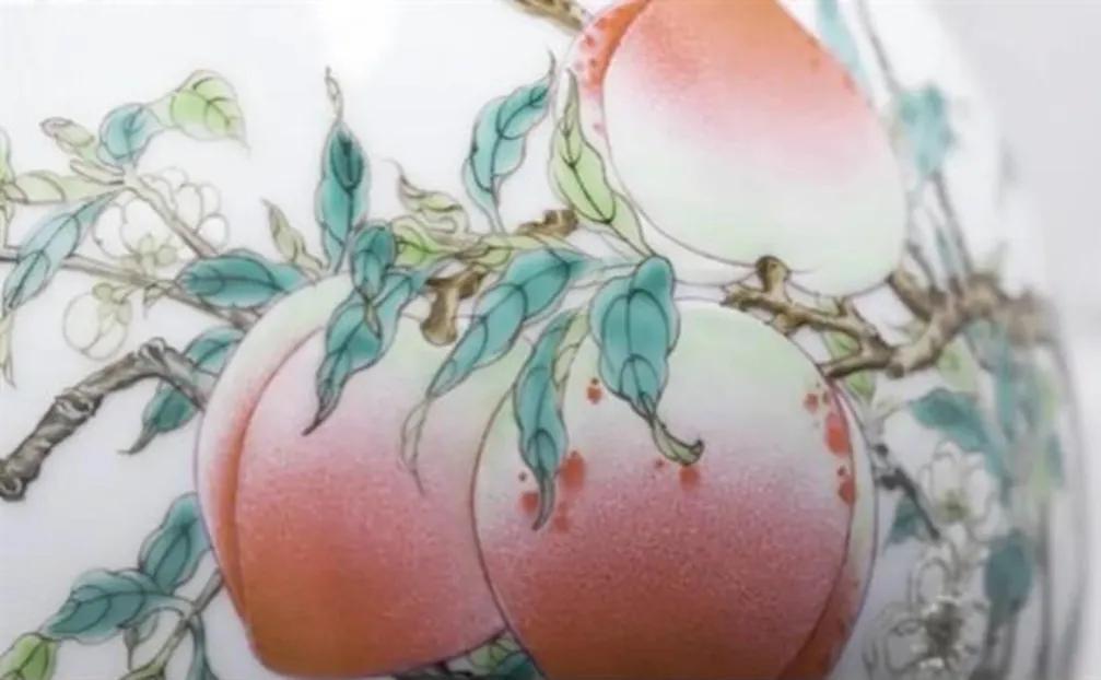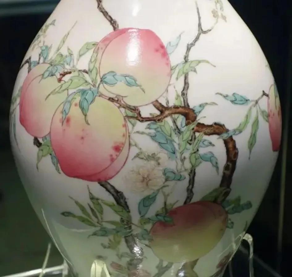 瓷瓶绘有蝠桃图案纹样,绘有过枝八桃,和两只翩飞的蝙蝠。其中,“蝠”即“福”的谐音,桃是象征“寿”的图案,“蝠桃”即是“福寿”的意思,寓意福寿双全。据考证,这种瓷器乃帝王后妃做寿之用。