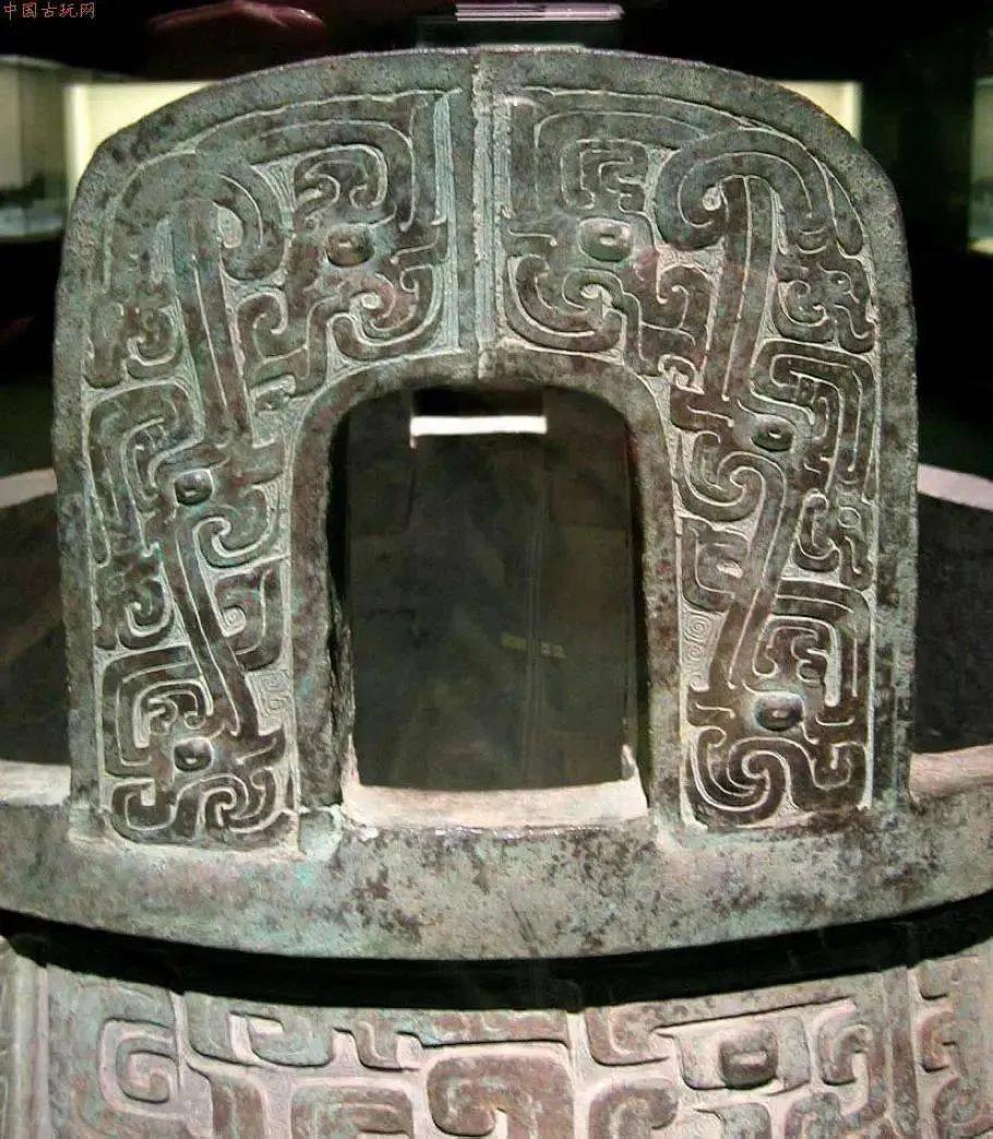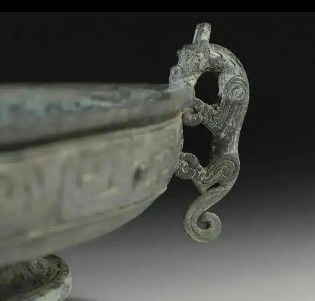 盘的前后各攀有一条立体曲折角龙,龙头耸出盘沿,曲体卷尾,攀缘于盘腹之外壁,作探水状;腹壁装饰着变形兽体纹。