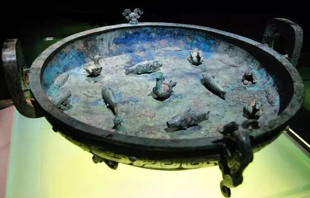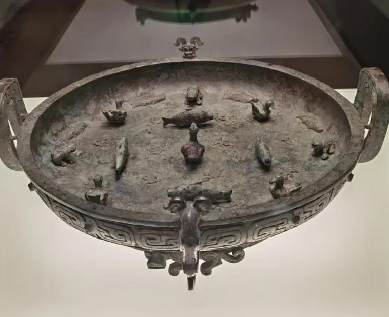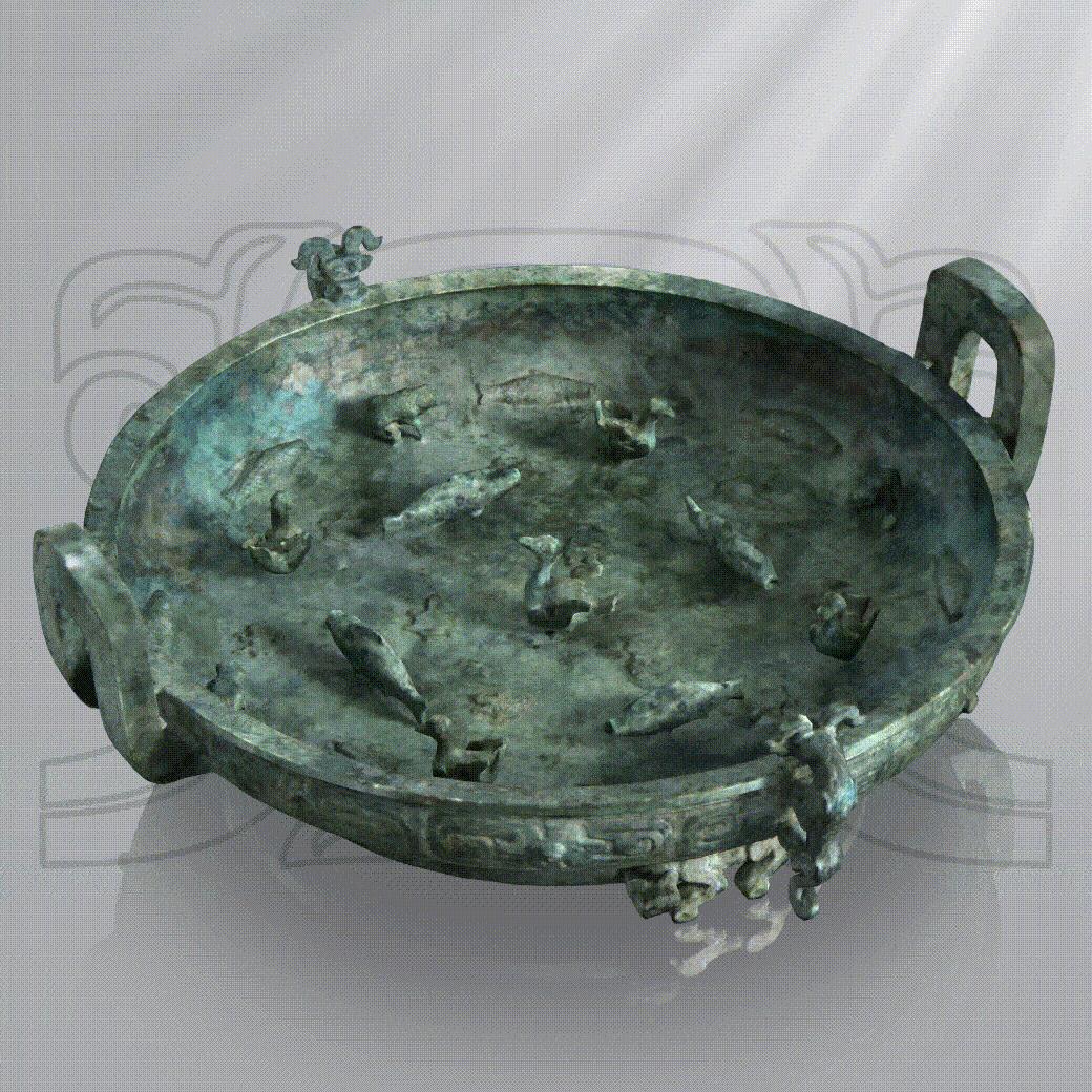 盘内装饰了浮雕和立雕的各种水生生物,鱼、龟、蛙、水鸟一应俱全,这些小动物平均长度只有6.5厘米,每个圆雕动物均能原地作平面三百六十度的旋转。