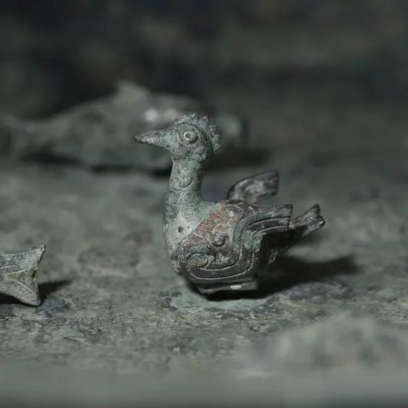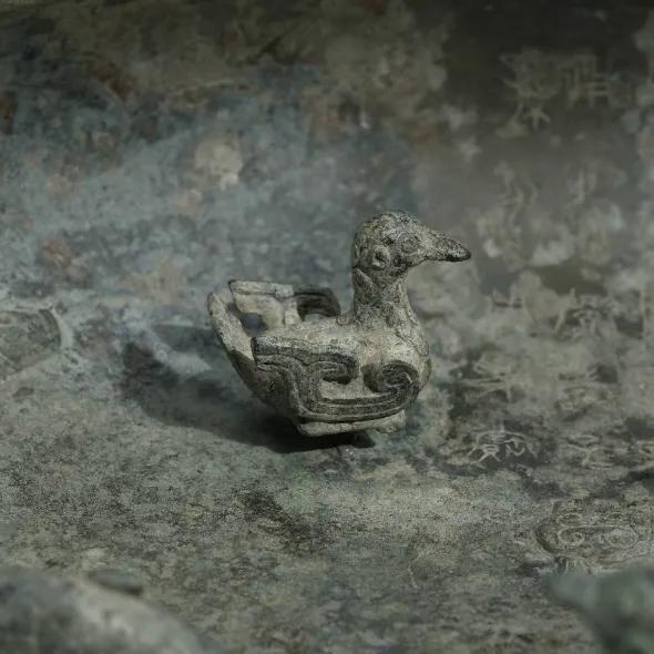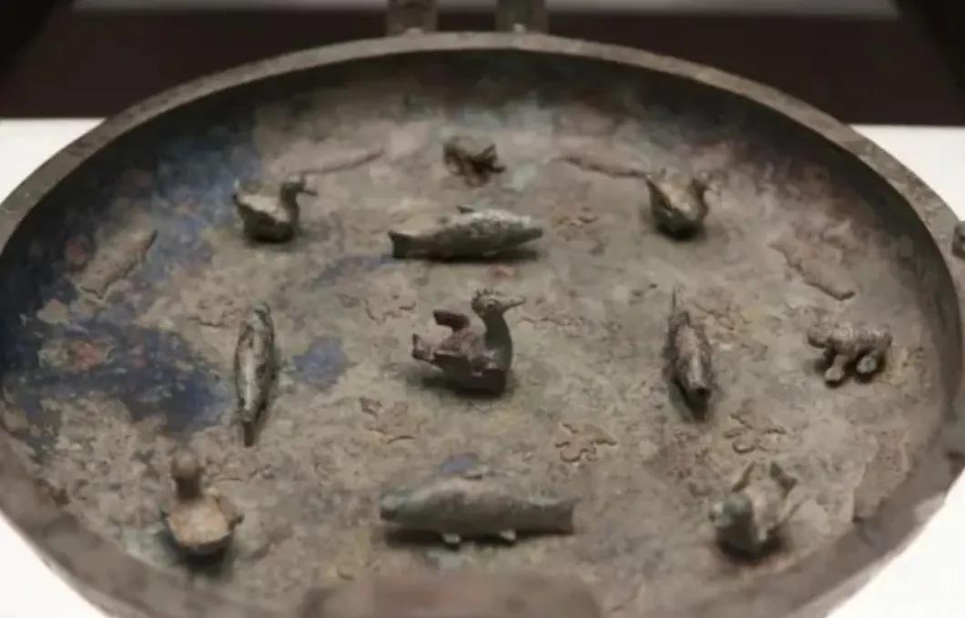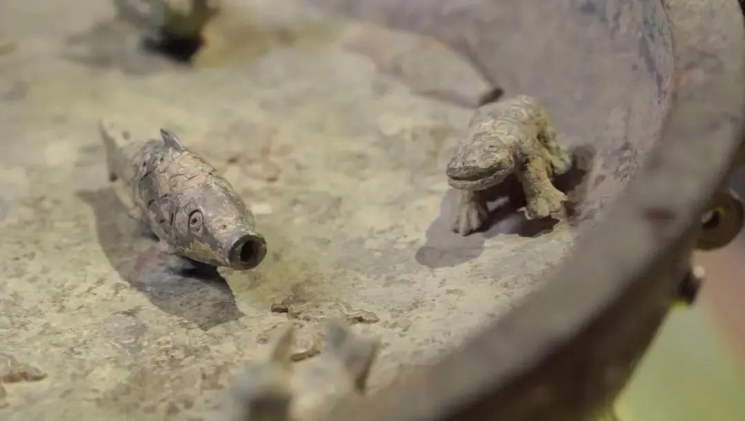 考古人员借助了计算机断层扫描,也就是CT技术,研究了小动物的内部,发现它们是用一根圆形的转轴与盘底连接在一起的。其中,小青蛙套在一根蘑菇形的转轴上,转轴连着盘底,这么一来,小青蛙如何扑腾都不会脱落。鱼和鸟则是用像宝剑一样的转轴卡住,防止脱落。工匠根据圆雕动物的不同形状设计了不同的转轴。