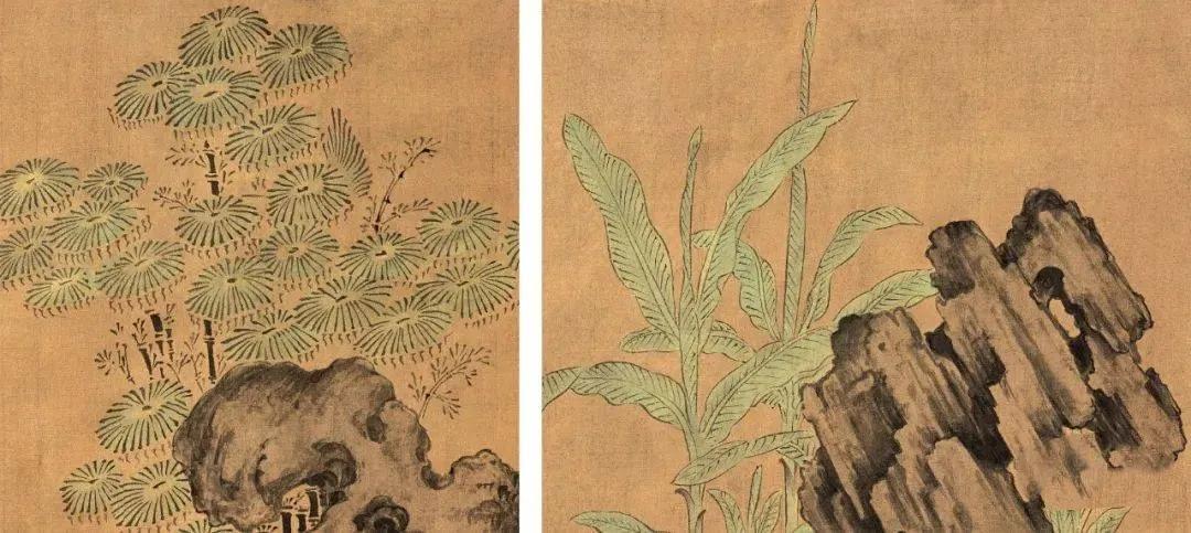 孙位不仅对画中人物的刻画费了一番心思,就连画中的村托物,蕉石和器具的用笔也不一般。画中蕉石用细紧柔劲的线条勾出轮廓,然后渲染墨色,山石的质感就显露出来了。图中的几株树是用有变化的线条勾出轮廓,再用笔按结构皴擦,而且这几株树也各有不同的画法。画中人物彼此之间以蕉石树木相隔,使气氛静穆安闲。