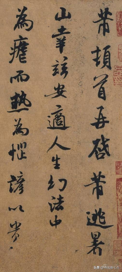 《竹前槐后帖》是米芾晚年时期(约1105年)创作的一首七言绝句。这首诗描绘了一幅夏日午后静谧美好的画面,表现了作者悠然自得的生活态度。从书法角度来看,《竹前槐后帖》堪称米芾晚期书法之巅峰之作——笔力遒劲有力,结构紧凑而又不失灵动,完美地诠释了“稳不俗、险不怪、老不枯、润不肥”的艺术理念。