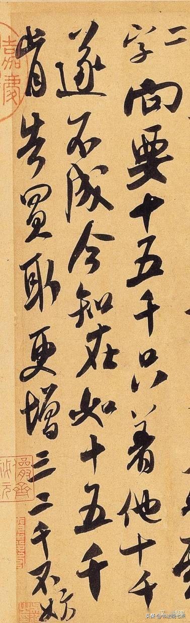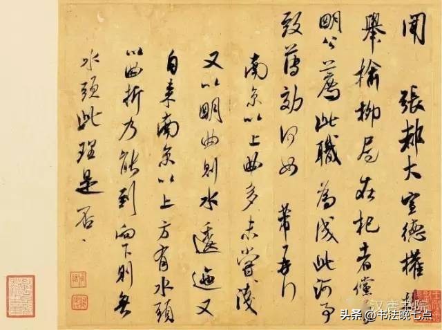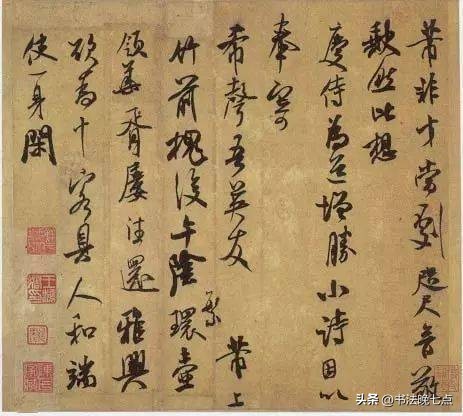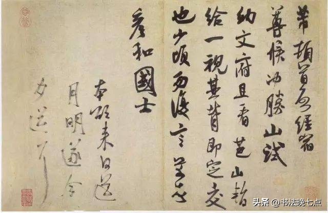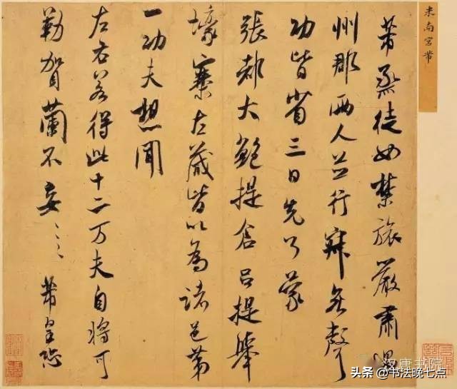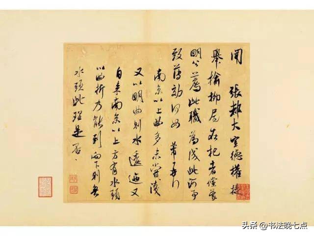 尺寸:纵29.4厘米,横33.8厘米释文:“闻张都大宣德,权提举榆柳局在杞者。傥蒙明公荐此职,为成此河事致薄效何如。芾再拜。南京以上曲多未尝浅,又以明曲则水逶迤。又自来南京以上方有水头,以曲折乃能到。向下则无水头。此理是否。”