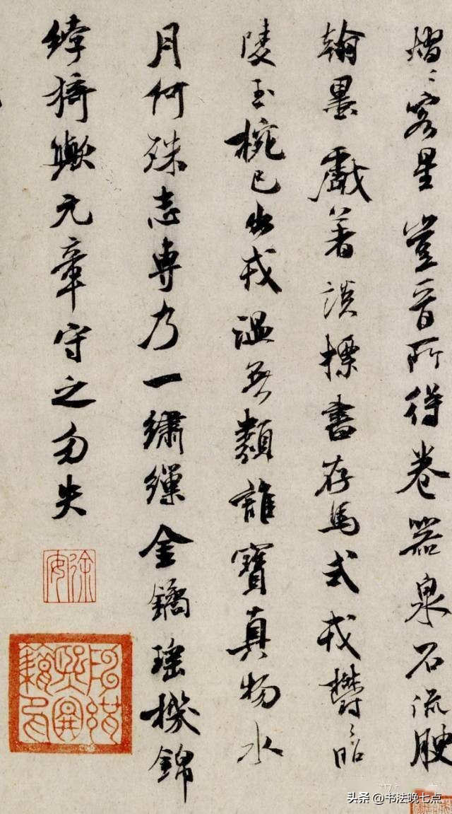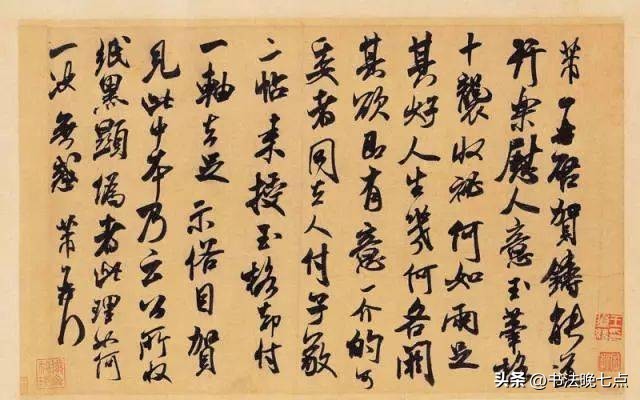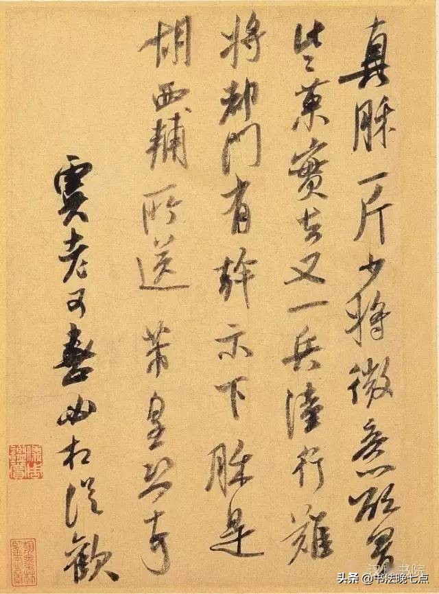 《值雨帖》是米芾晚年(约1104年)创作的一件重要作品。此帖记录了米芾因天气原因未能如期拜访朋友的情景。虽然只是简短的文字描述,但通过米芾那极具个性化的笔触,我们可以感受到他对生活的热爱以及对待每一件事认真负责的态度。《值雨帖》用笔老练洒脱,字形饱满圆润,给人一种从容不迫的感觉。