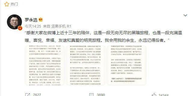 6月12日深夜,罗永浩已为这次退网预热。当晚,他在微博宣布,6月13日正式退出微博和所有的社交平台,「再次埋头创业去了」,并开始删博。