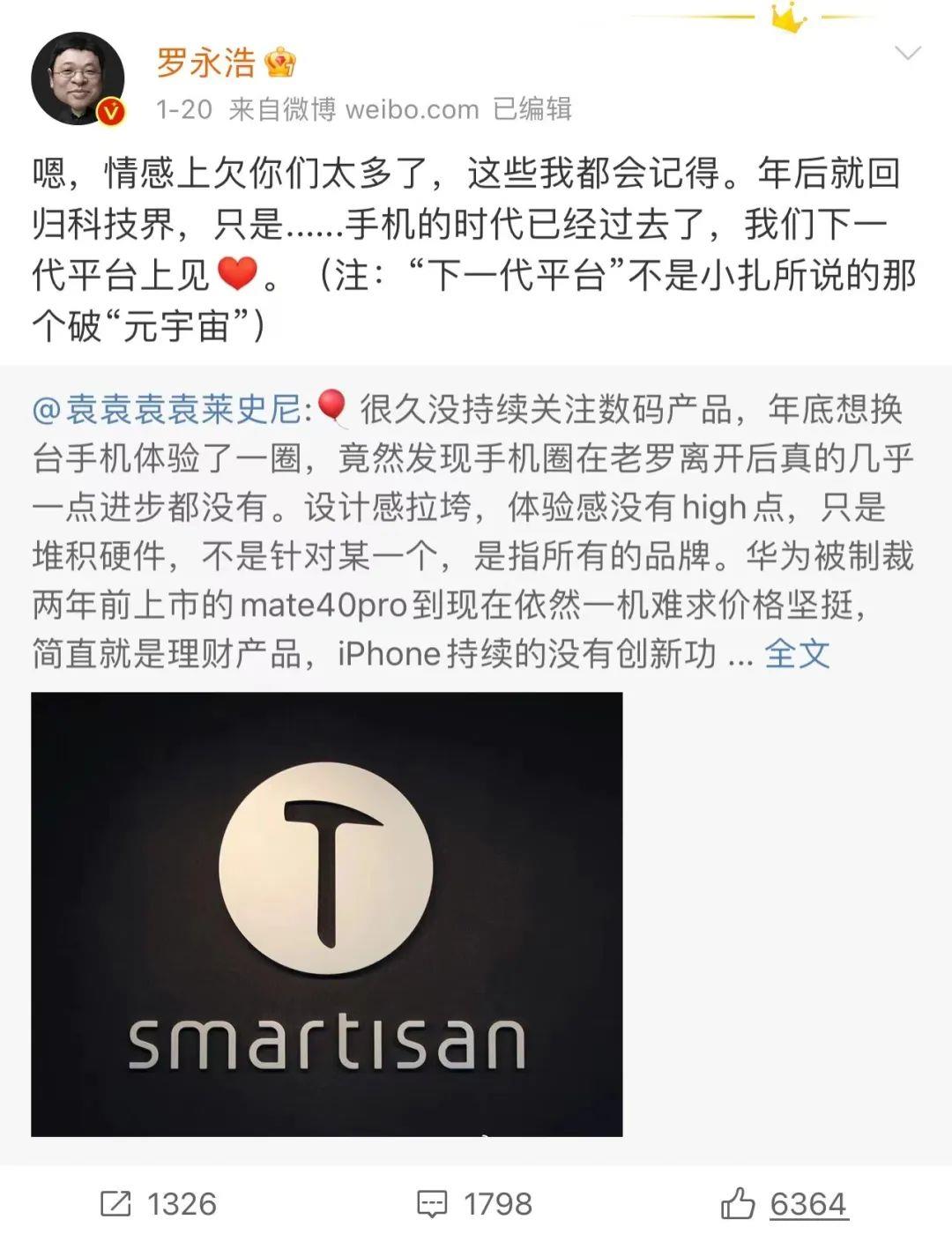 2022年1月20日凌晨,罗永浩在微博上转发网友评论,预告自己年后将回归科技界并强调,手机的时代已经过去了,下一代平台见,而「下一代平台」并不是扎克伯格所说的破「元宇宙」。这个消息一出网友们又是热议纷纷,有人说好好的直播带货不做,又回什么科技行业,老罗真是疯了。也有投资人认为,相比直播带货的快速回报,老罗所谓的「下一代平台」属于赚钱能力存疑,行业风险未知甚至偏高的项目,「万一失败了,就不只是6亿的窟窿」。