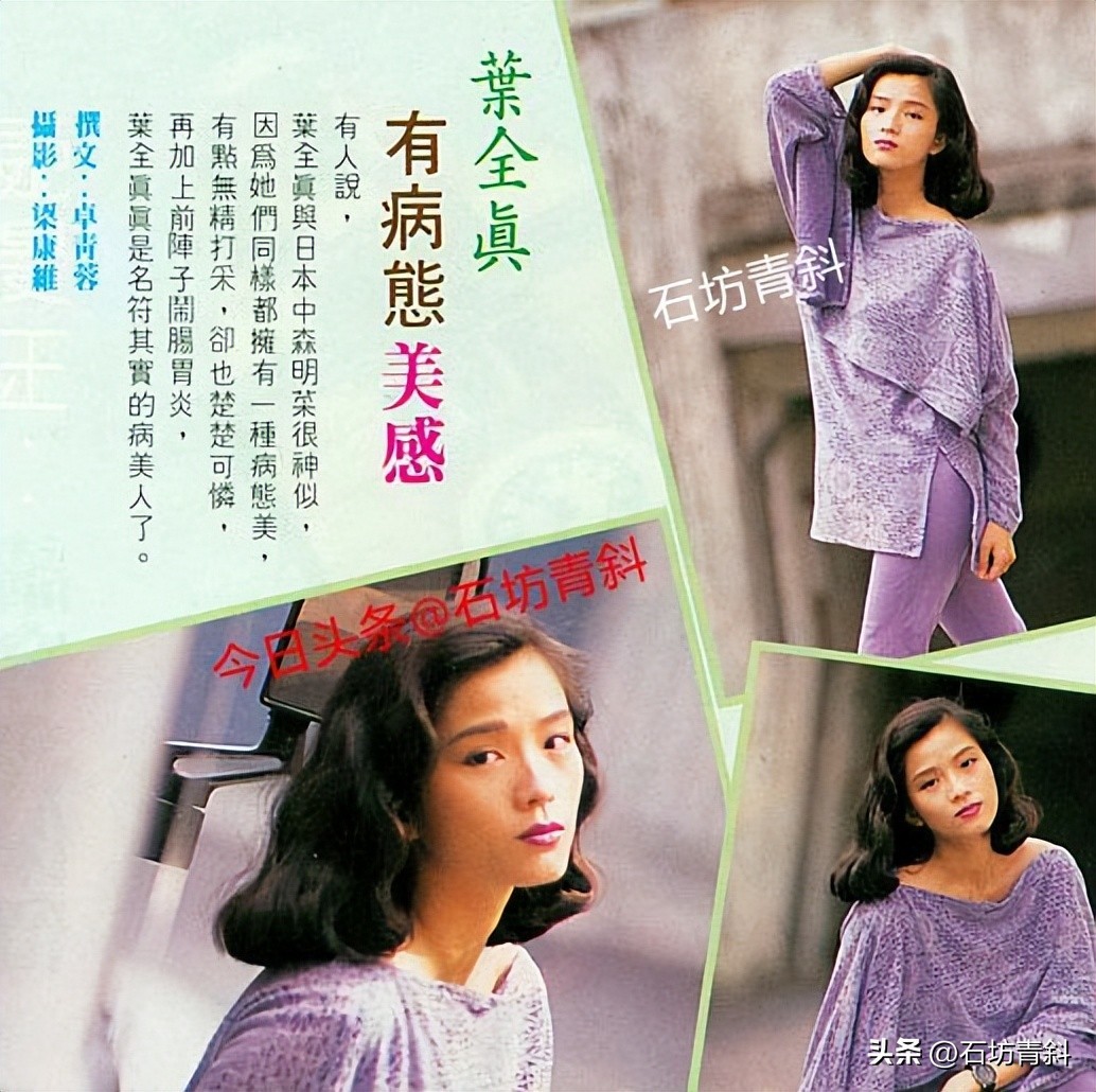 叶全真的脸型线条清晰,高艳清冷的外形,非常富有辨识度。这种毫无雕琢的美在当时被媒体称作“王祖贤第二”。