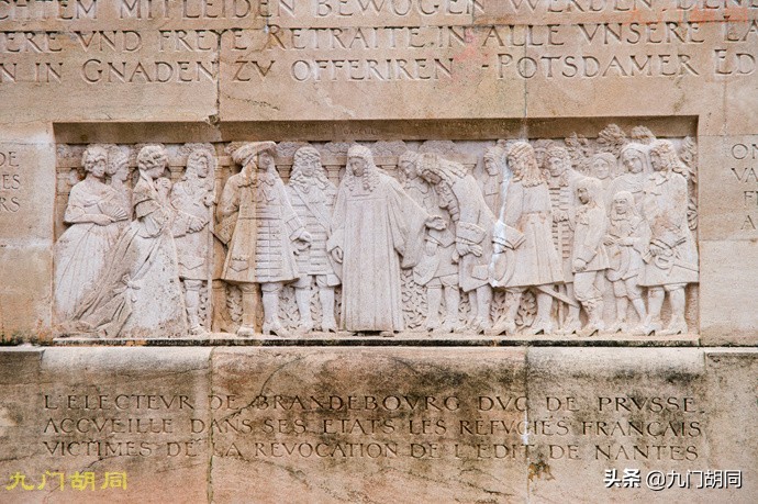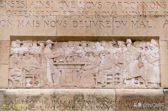 纪念墙上还有几件浮雕,都是历史上宗教改革有关的事件。从个别文字推测这幅可能是宗教改革时期日内瓦人与伯尔尼人谈判或商量什么事。日内瓦的宗教改革受伯尔尼影响很大。
