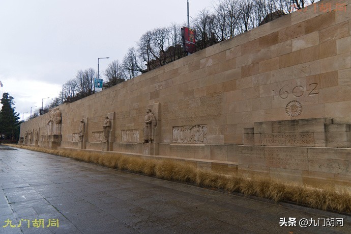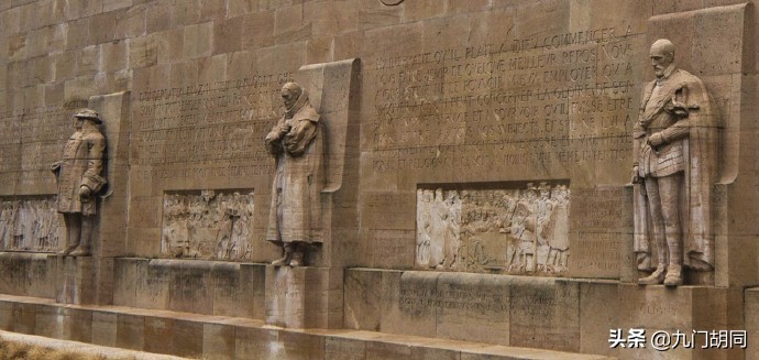 日内瓦大学主楼对面,有一座宗教改革纪念墙(也称纪念碑)。位置大致就是过去的日内瓦老城城墙。纪念墙建于1909年,以纪念加尔文诞生400周年和日内瓦大学建立350周年。墙上的浮雕和人物雕像都是与欧洲宗教改革有关。当然,最主要的还是纪念日内瓦历史上的重要人物约翰.加尔文。